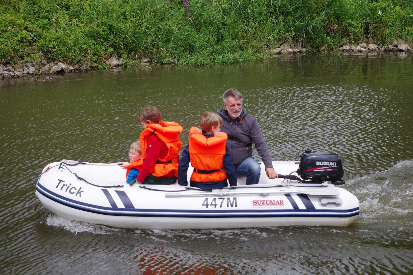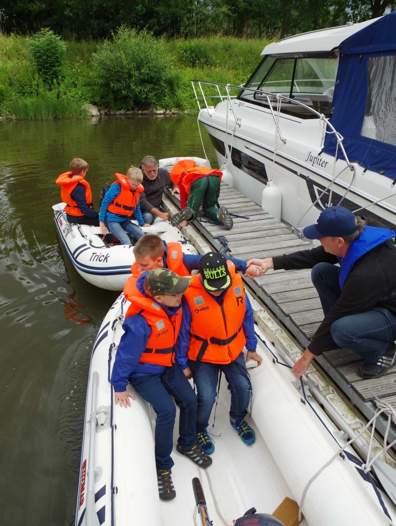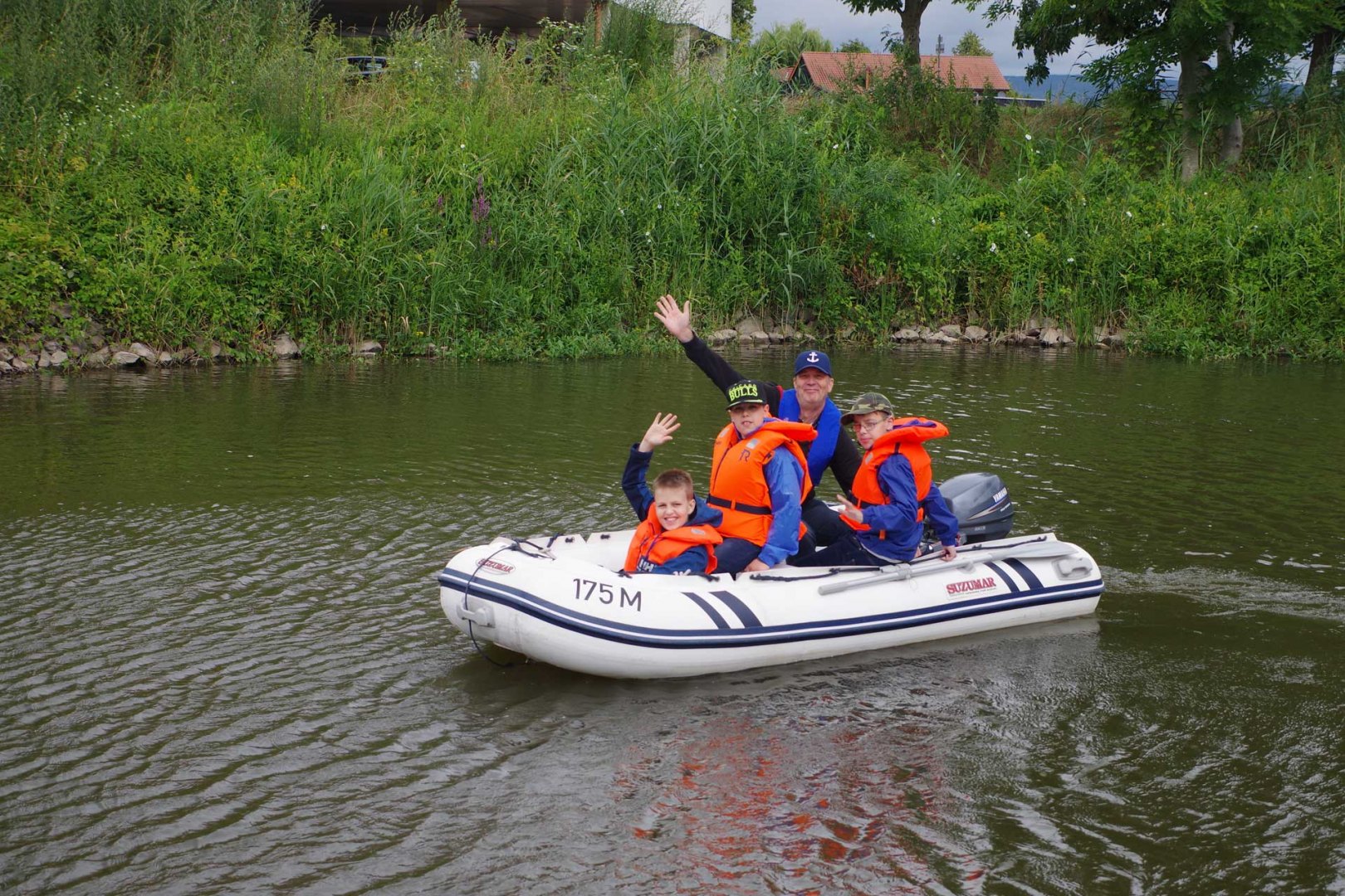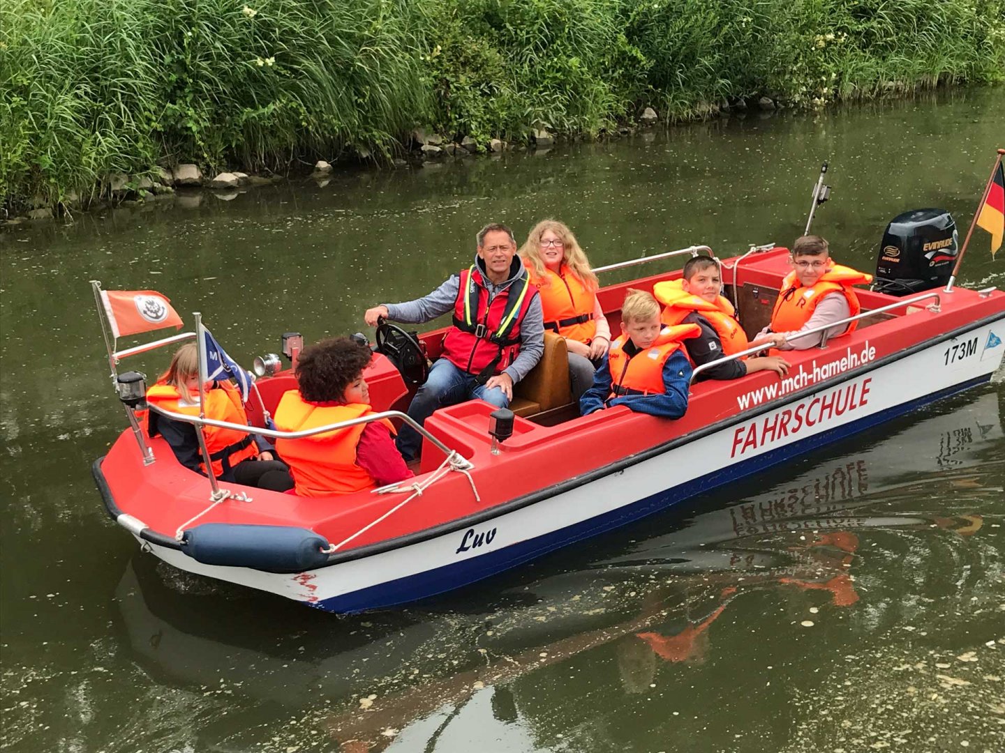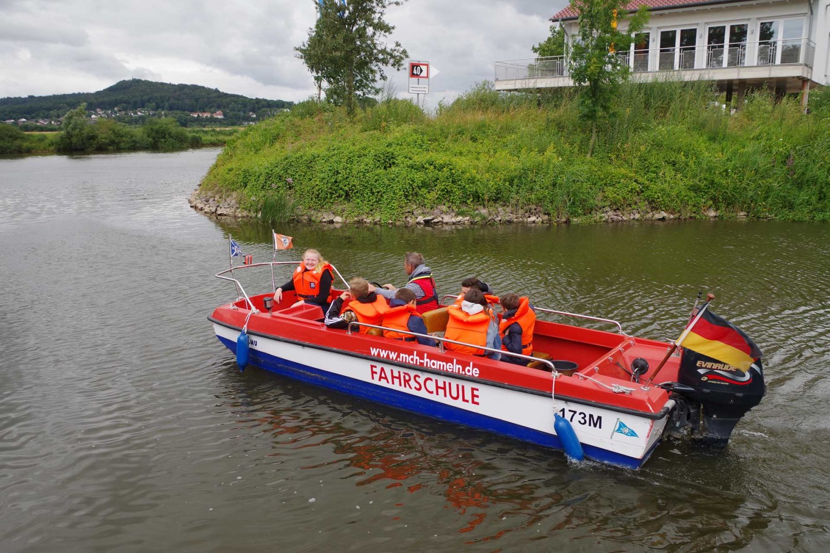 (RA-St.) Wenn 4,5 Millionen Tonnen Wasser innerhalb kürzester Zeit dafür sorgen, ein Boot um gut drei Meter anzuheben, ist das nicht nur für die teilnehmenden Kinder der Ferienspaß-Aktion beim MC-Hameln (MCH) äußerst beeindruckend. Dank der wieder einmal vorbildlichen und freundlichen Unterstützung des Hamelner Schleusenteams konnten die Ferienspaßkinder an zwei Tagen hautnah erleben, wie eine Schleuse funktioniert und wie turbulent so eine Bootsschleusung sein kann. Doch auch die viel ruhigere Fahrt durch den Hamelner Stadthafen war durchaus spannend, ebenso wie die unmittelbare Beobachtung des Ablegemanövers der „Stadt Hameln“ vom Anleger am Stockhof. Doch da Kinder von Natur aus neugierig sind, muss natürlich auch einmal ausprobiert werden, wie es sich denn so anfühlt, wenn man mit einem kleinen Motorboot durch die von der „Stadt Hameln“ verursachten Wellen fährt. Dank der drei erfahrenen Bootsführer des MCH (Matthias Albrecht, Axel Hartmann und Dieter Zahn) war dieses kleine Abenteuer jedoch ebenso gefahrlos zu bewältigen wie die etwas später folgende zügigere Bootsfahrt auf der Weser bei Wehrbergen. Dabei zeigte sich die von Axel Hartmann gesteuerte „Flipper“ deutlich flinker als die vom ersten Vorsitzenden des MCH manövrierte „Luv“, die auch als Fahrschulboot des MCH treue Dienste leistet. Härter noch als die Niederlage gegen die „Flipper“ traf den ersten Vorsitzenden jedoch die Bemerkung eines Knirpses, ob er denn am Nachmittag wieder „das Tretboot steuere“. Doch am Nachmittag fuhren die drei Gruppen mit den Schlauchbooten aus der MCH-Jugendabteilung über die Weser – und dann durften die Ferienspaßkinder auch selbst einmal das Steuer übernehmen.