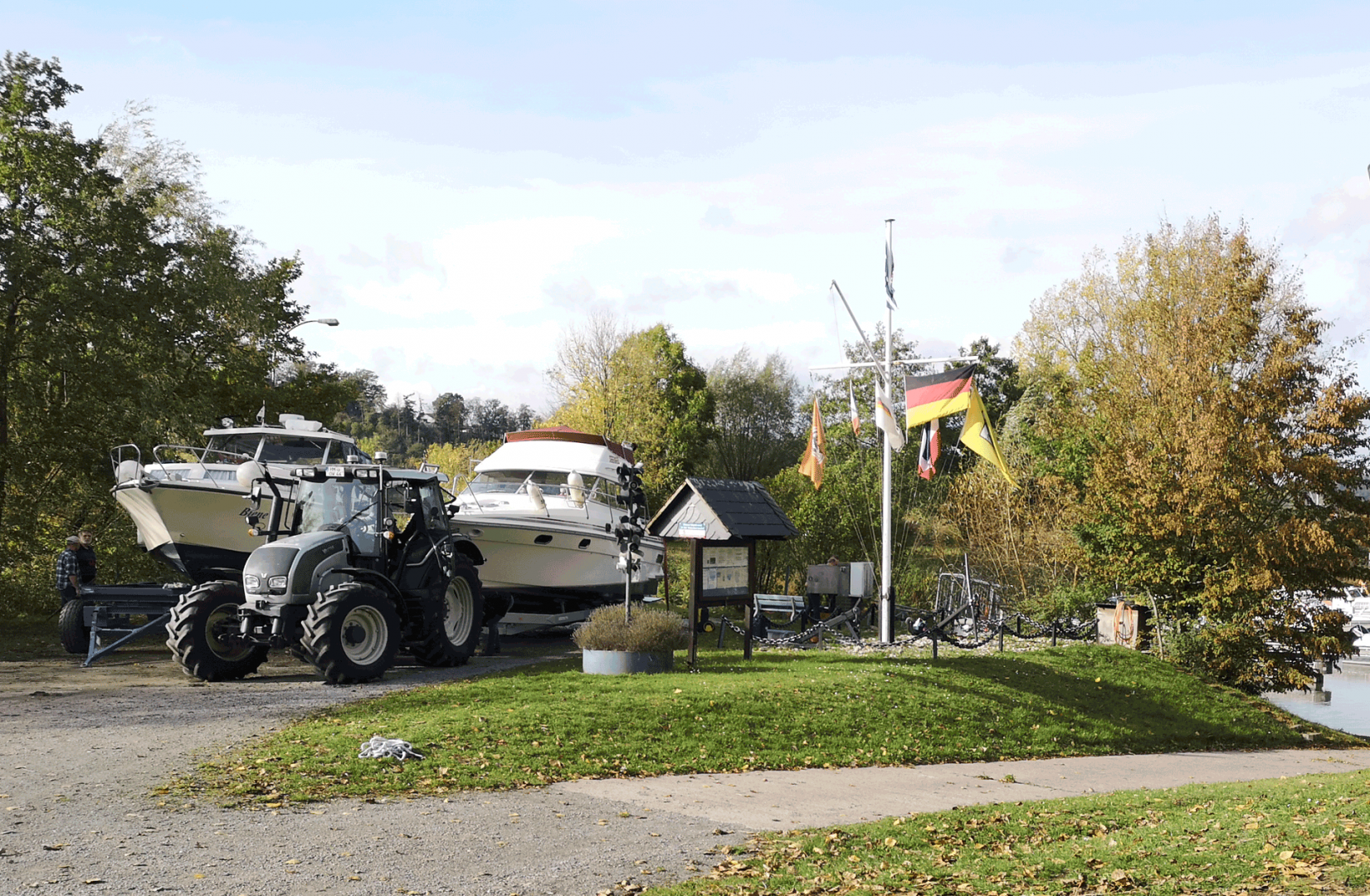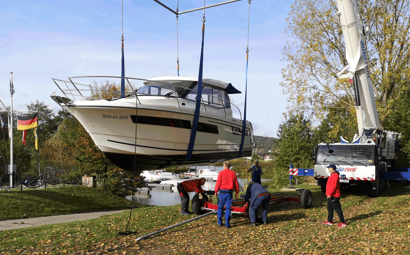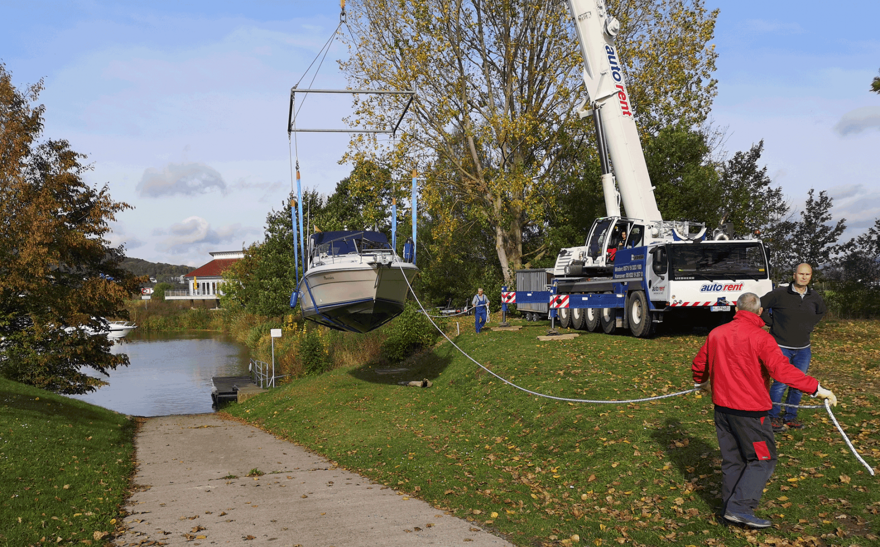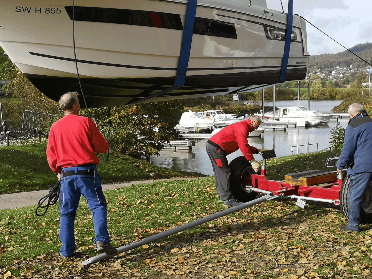 (RA-St.) Viele Male gesehen, doch immer wieder spektakulär: das Auskranen unserer Boote. Auch in diesem Jahr verlief die Aktion im Prinzip reibungslos; alle Boote erreichten sicher das Land und wurden fachmännisch auf den Hafentrailern abgesetzt. Doch so ein Hafentrailer kann ein sehr eigenes Wesen sein. Unser SBF-Binnen Ausbilder, Harald Röger, kann davon ein (im Endeffekt) fröhliches Liedchen singen. Im letzten Jahr stand seine „Hanne“ noch mit geneigtem Haupt, Verzeihung, Bug, auf dem Trailer in der Halle und blickte stets auf den, immerhin frisch gefegten, Hallenboden. In diesem Jahr wollte Harald seinem Stahlschätzchen dieses Dasein ersparen und passte den Trailer an. Sogar kurz vor dem Auskranen wurde noch letzte Hand angelegt und am Trailer ein Stahlträger ausgeschnitten – dann ging es Richtung Hafen. Nun könnte ich hier fast meinen Lieblingsdichter zitieren, aber eben nur fast:
