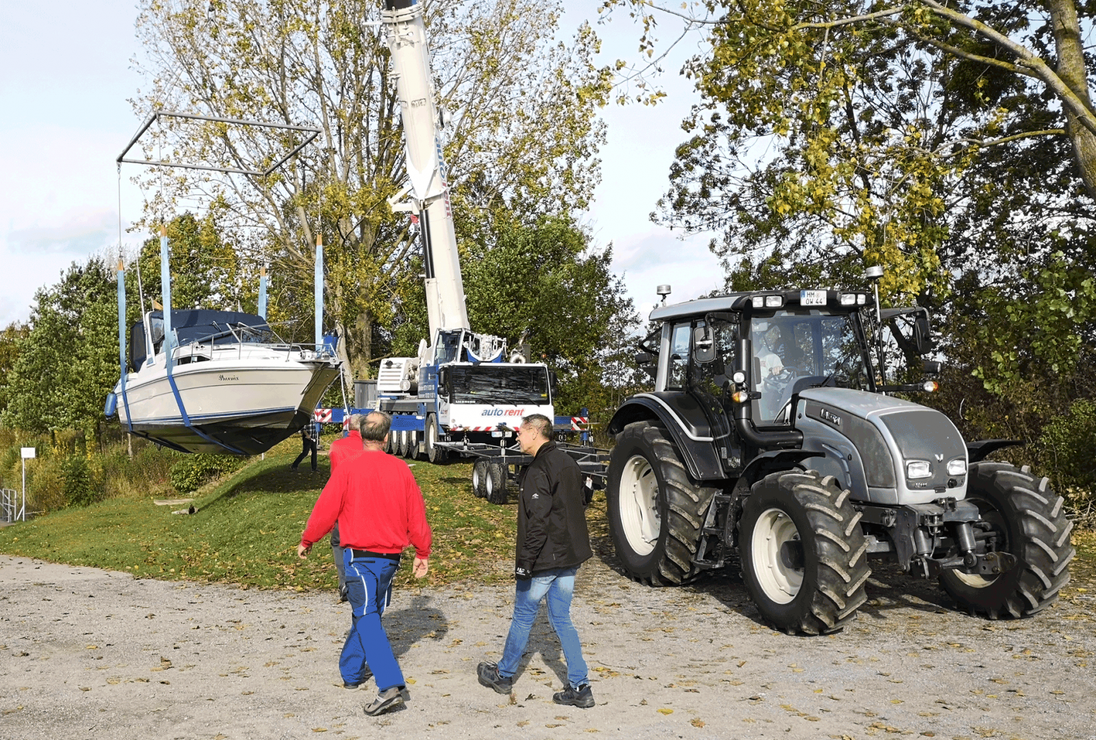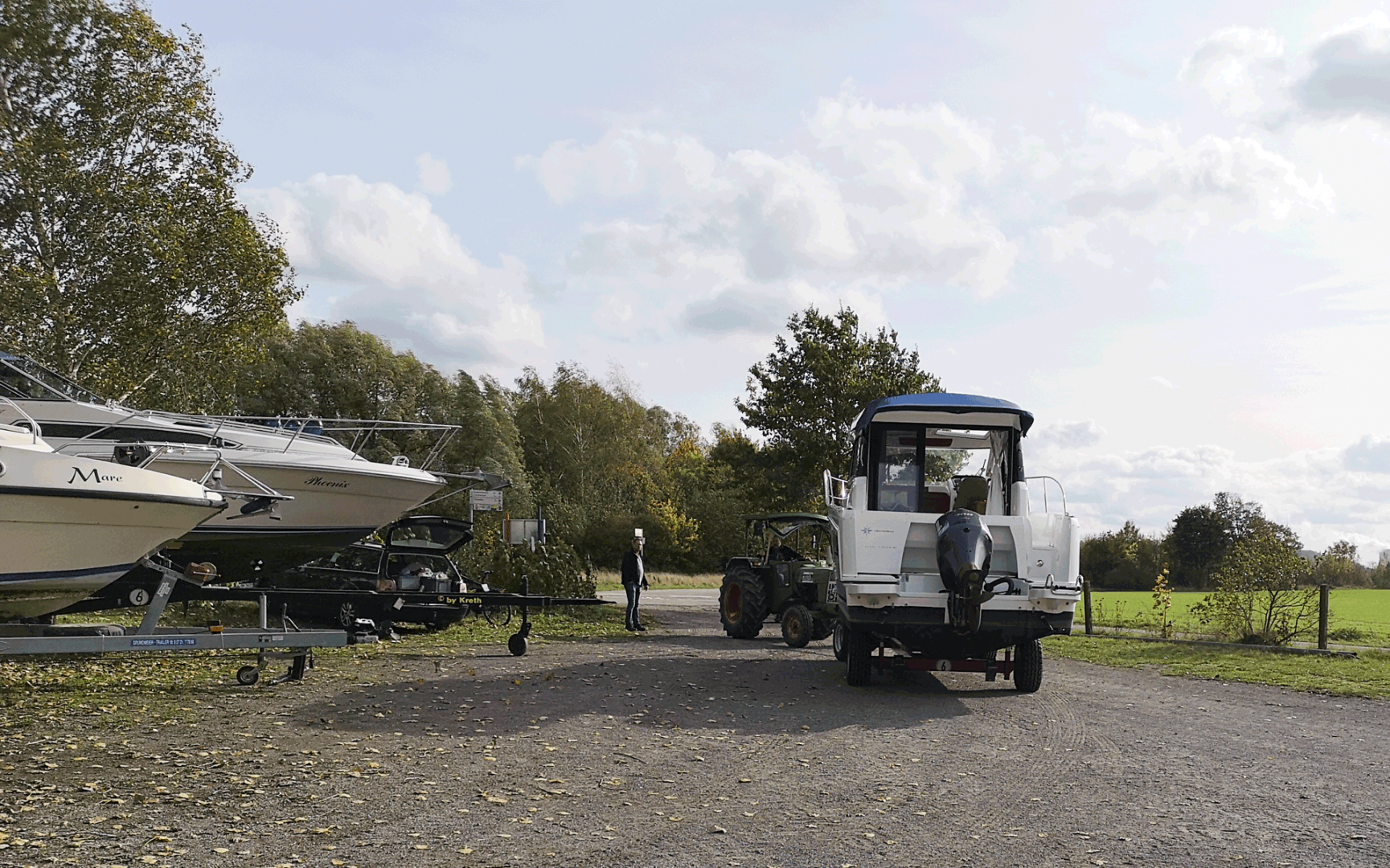 Das Auskranen und der Bootstransport gingen in diesem Jahr ansonsten wirklich zügig – der Organisation unseres ersten Vorsitzenden, Matthias Albrecht und des zweiten Mannes in unserem Verein, Axel Hartmann, sei Dank. Auf dem Hafengelände rangierte Harald Röger, trotz der Aufregung rund um die „Hanne“, mit seinem Schlepper die Boote sicher auf ihre Warteposition. Axel begleitete den Kranführer als Fahrer des Begleitfahrzeugs in diesem Jahr persönlich zum Hafen und danach zu seinem nächsten Einsatzort. Für sicheres Geleit der Boote, auf ihrem Weg in die Halle, sorgte Sabine Gaudlitz. Mit einer Engelsgeduld (bei 6 km/h) hielt sie dem Schlepperfahrer den Rücken frei. Apropos Schlepperfahrer: ein Mann*, der sein Handwerk absolut beherrscht! Mit Ruhe, Übersicht und äußerst präzise dirigierte er die Boote in die Halle und stellte sie zentimetergenau dort ab, wo sie hin sollten. Chapeau!