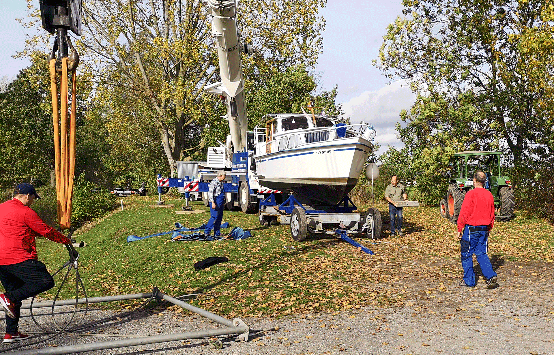 Gut, tot mag etwas übertrieben sein. Doch eine Deichsel, nicht mehr fest mit der Achse verbunden, ist für einen Schiffstransport eher suboptimal. Also musste der fleißige Helfer noch einmal ran und nun, die vormals nur geheftete Deichsel, jetzt fest verschweißen. Wir waren alle sehr neugierig, ob die Reparatur den Weg des Trailers (diesmal sogar mit Boot) zurück zur Bootshalle ermöglichen würde. Denn die „Hanne“ ist, mit Verlaub, nicht die schlankeste. So gestaltete sich auch das Heben aus dem Wasser anders als beim Synchronschwimmen, doch letztendlich kam die „Hanne“ auch ohne Diät in Balance und schwebte auf ihren Trailer. Und der brachte sie tatsächlich sicher ins Winterlager. Natürlich musste der Trailer vor der endgültigen Landung noch provisorisch angepasst werden. Im nächsten Jahr wird er nun endgültig vollends passend gemacht. Wir sind sehr gespannt …
